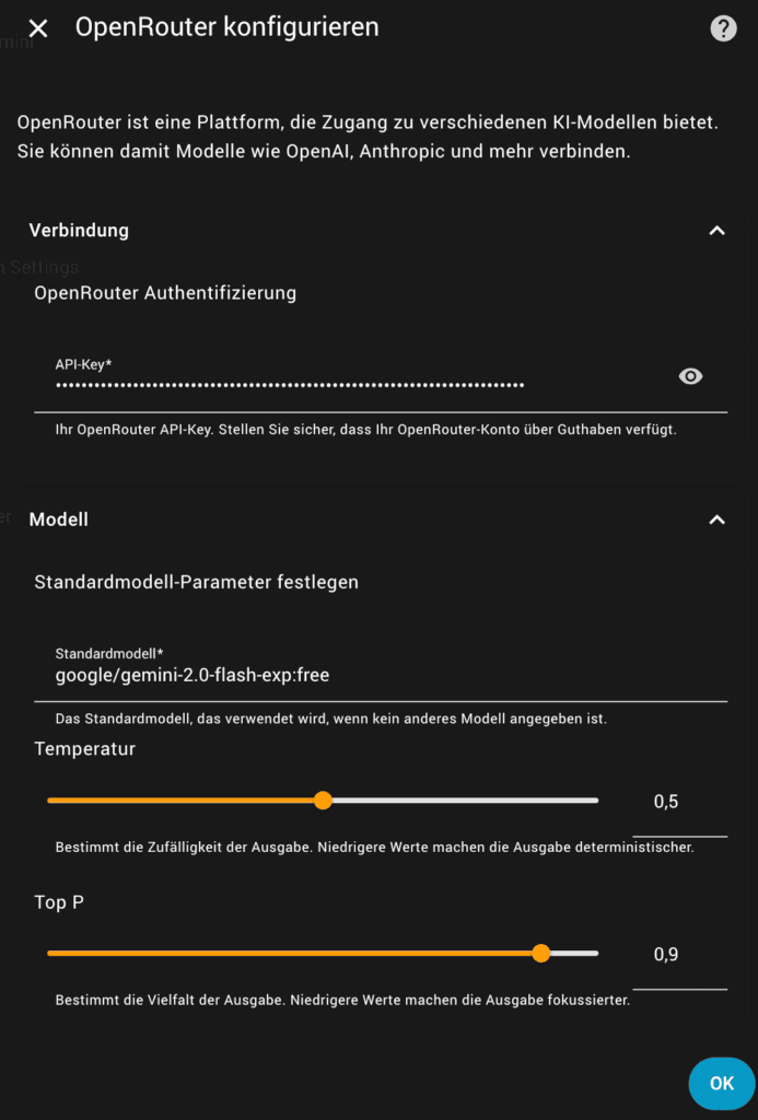 Unter AI Settings kann ich unter Provider Google, Groq und LLVision angeben.